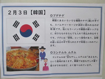 今日は「節分の日」ですが、グローバル月間にちなんで、今週から「世界の料理」が給食のメニューになっています。