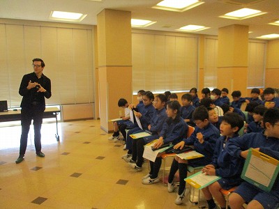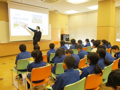 今日は、イギリス・ウェールズ出身のゲストティーチャーが来校され、4年生が英国の文化面などを中心に、お話をうかがいました。