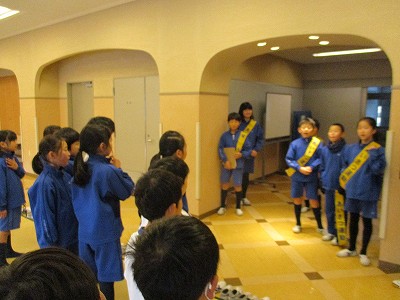 ヨガが終わったところで、児童会本部のメンバーが、あいさつ運動に来てくれました。