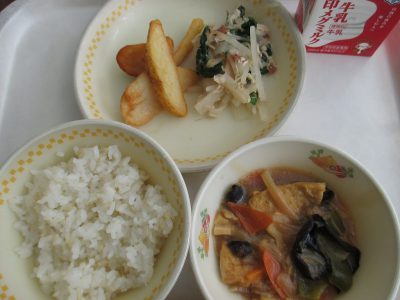 厚揚げ、人参、玉ねぎ、竹の子、きくらげ、豚肉、ピーマンとたくさん野菜が入っています。