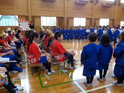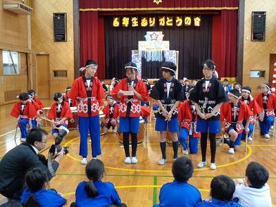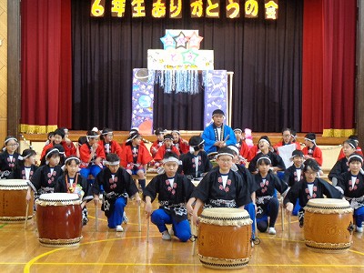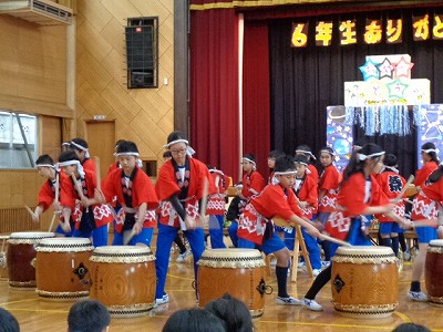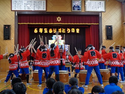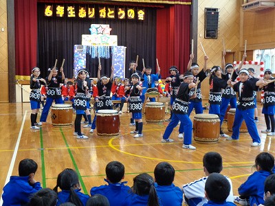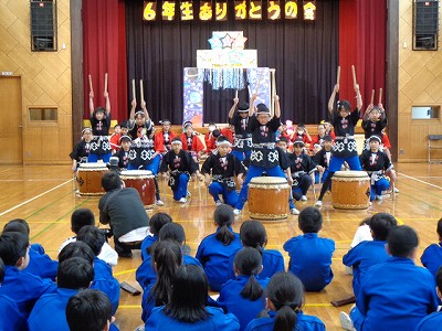 6年生からは、在校生に和太鼓演奏のプレゼント!