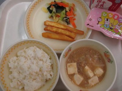 豆腐の他に、白菜、大根、れんこん、玉ねぎが入ったマーボー野菜です。スープで野菜を煮込んでいるため、溶け出た栄養分も効率よくとることができます。野菜がプラスされたため、食感もさらに良くなりました。