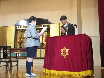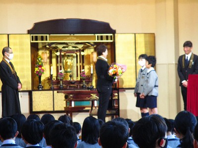 本校の皆勤賞や精勤賞のほか、琵琶湖疏水新聞コンクールや、佛教大学俳句大賞などの入賞、漢字検定の最優秀賞などが先生から手渡されていました。