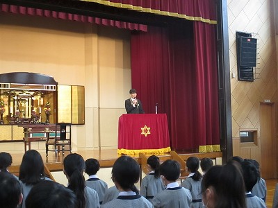 その玉を通している一本のひも。それこそが「仏様の教え」です。「仲間と共ににがんばろう」と一つひとつの玉が輝くと、より大きな光となって明るく輝きます・・・。そんな楽しい学校生活になっていくように・・・とお祈りされました。