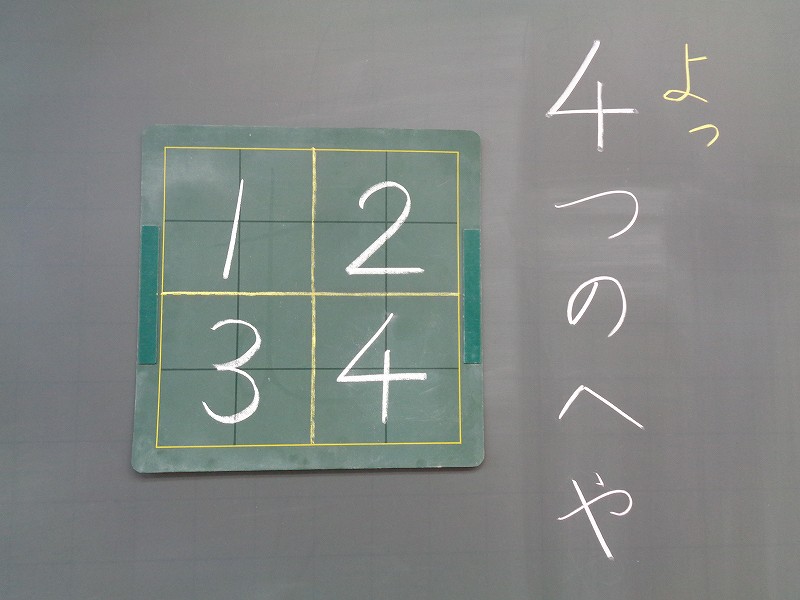 ひらがなのれんしゅうを するまえに、みんながれんしゅうするマスが 4つにわかれていることを おぼえましょう。