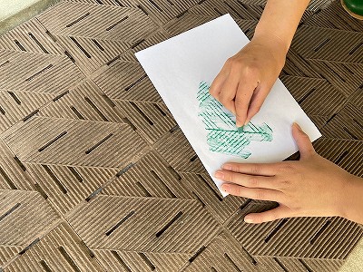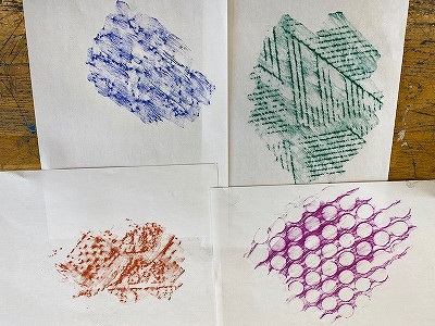 これは,でこぼこした ところに 紙をあてて,紙の上から クレヨンなどで こすると,もようとなって うつしとることが できます。でこぼこを うつして,形のおもしろさを 味わう学習です。