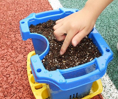 人さし指で土に穴を開け、1つずつ丁寧に種を入れています。