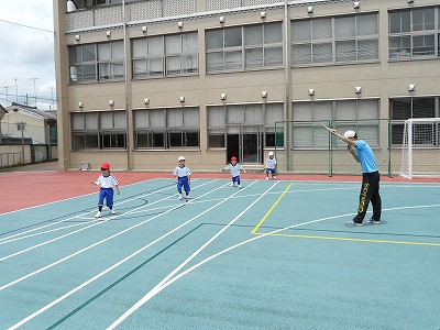1コース・2コース・3コース・4コースのスタートの位置を確かめた後、先生のスタートの合図を聞いて、元気いっぱい走り出しました。