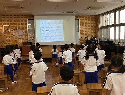 初めて「聖歌集」を手にして歌う学習ですが、みんな“いい感じ”!