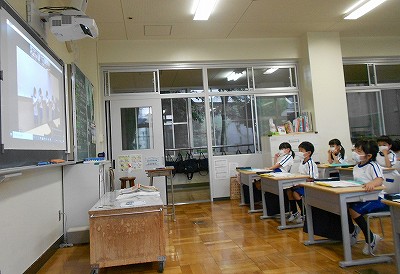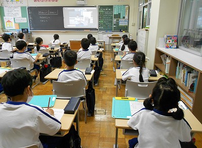 本校では、毎年、1年生と2年生がペアになって、2年生に学校を案内してもらう活動を行っています。今年度は、手をつないで一緒に活動するのが難しい状況のため、Zoomを使って2年生が学校紹介をしてくれました。