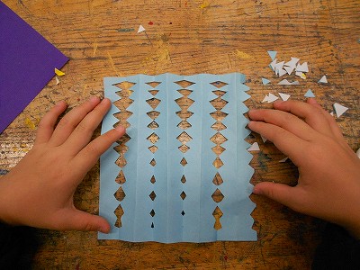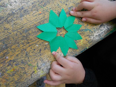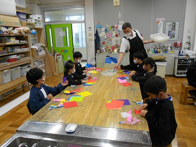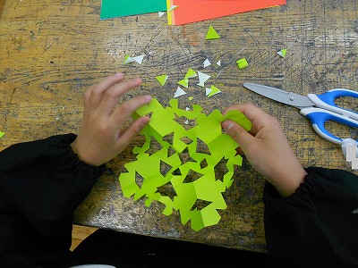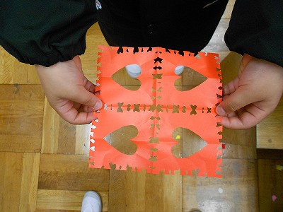 また、切った形を見て、「くまみたい」「ネクタイみたい」など、できた形や色紙の色などからイメージをもった姿も多く見られました。
