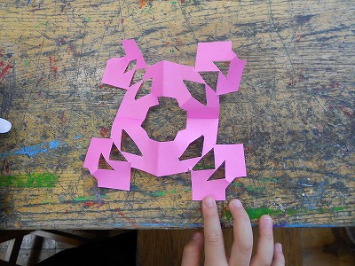 今日は「きって ちょきちょき」という題材でした。折り紙を折ったり、重ねたりして、いろいろな形をつくります。