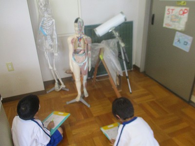 実験器具や人体模型、植物、水槽で泳ぐ魚など、いろいろなものを見せてもらい、お気に入りのものをスケッチしました。