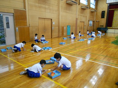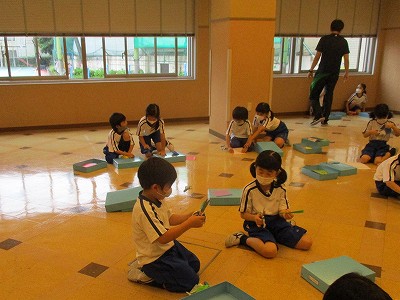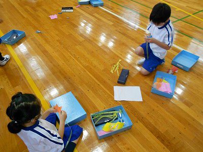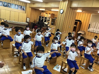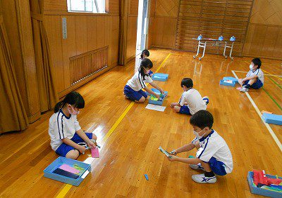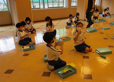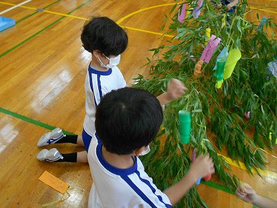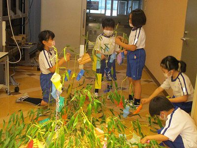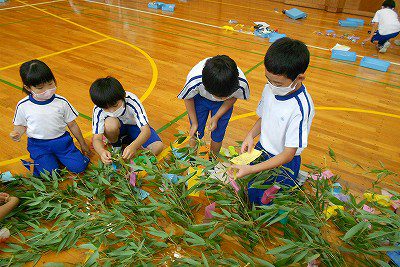 【七夕集会】は、毎年体育館で行っていますが、今年は密を避けるために、体育館と和の部屋の2つに分かれました。どちらの教室も、1年生と2年生がペアになり、七夕飾りを作ります。はじめは、やや緊張した様子でしたが、お互いに自己紹介をして七夕飾りを作り始めると、仲良く楽しい時間を過ごすことができました。
