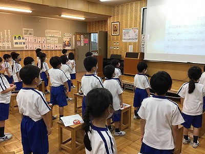 久しぶりに「♪心から心へ」の歌唱から1年生の音楽が始まりました。