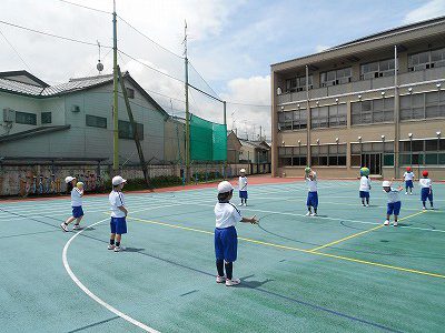 ペアのお友達がいる方向にしっかりと投げ、また、バウンドしたボールを受ける練習しています。