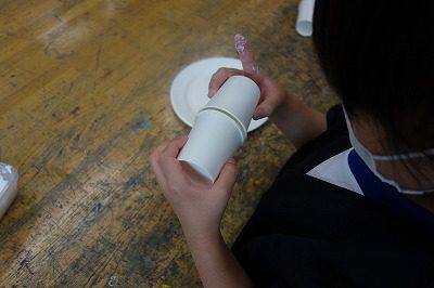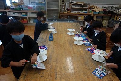 2つ合わせた紙コップを軸にして,紙皿を貼るときには,となりのお友達と協力しながらつくっている姿もちらほら見られました。