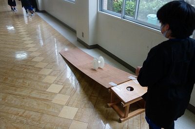 しくみが完成すると,5か所設営されている「おためしスロープ」で転がり具合を確認します。まっすぐ転がるのを見て飛び上がって喜んだり,スロープから落ちて何度も試したりしていました。