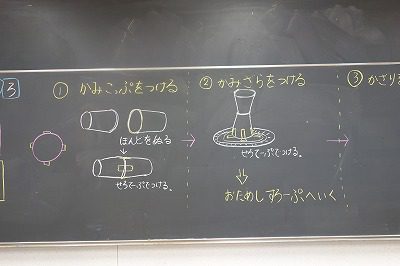 まずは,今日のめあてを確認したあと,転がるしくみのつくりかたを聞いて,さっそくつくりはじめました。