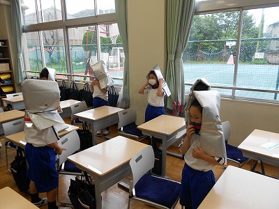 雨のため、根っこマラソンは中止になりました。予定を変更して、教室で「防災頭巾」をかぶる練習をしました。