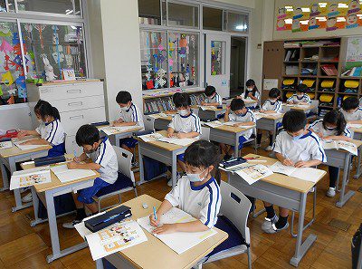 次は、絵日記のノートを開いて、自分の体験を文で書きます。今日は、先日の「七夕集会」を題材にしました。書き始めの文をみんなで考えた後は、「したこと」と「思ったこと」を文で書きました。