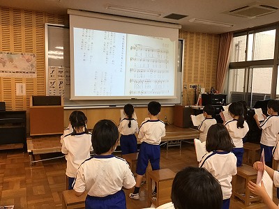すぐに、メロディをキャッチした1年生は、「たまねぎを…」「トントントン・」から、身振りを入れて歌ってくれました。