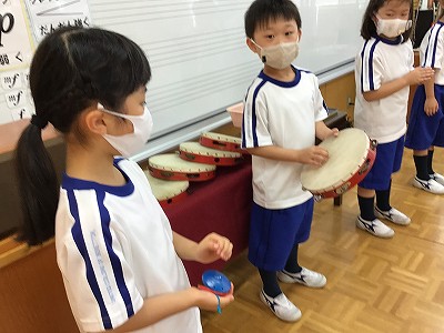 今日は、これらの細かなリズムを手打ちで練習した後に、リズム楽器で打つ時間を過ごしました。
