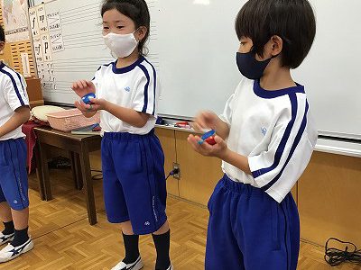 “タンブリン”や“すず”は、前回の「♪ぶんぶんぶん」の時に使いましたが、今日はさらに“カスタネット”も加わって学習を進めました。