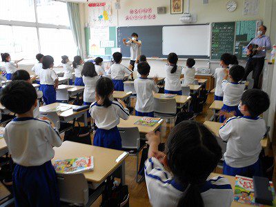 「♪アルプス一万尺」のメロディーに合わせて、英語で歌いながら手を動かしています。