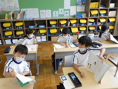 その後は、おとなりの席のお友達に見つけた言葉を紹介しました。近づいて話し合う活動ができないので、自分の席に座ったまま、見つけた言葉を見せ合いました。