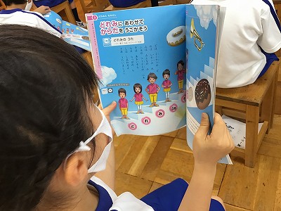 「♪ドレミのうた」や「♪ドレミのキャンディ」など、“ドレミファソラシド”が登場する歌を歌うところから始まりました。このページの絵にあるように、身体を使って“ドレミ…”を表す活動をしようと、練習中です。
