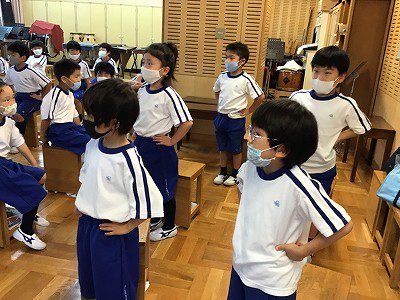 「♪ドレミのうた」や「♪ドレミのキャンディ」など、“ドレミファソラシド”が登場する歌を歌うところから始まりました。このページの絵にあるように、身体を使って“ドレミ…”を表す活動をしようと、練習中です。