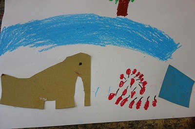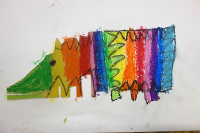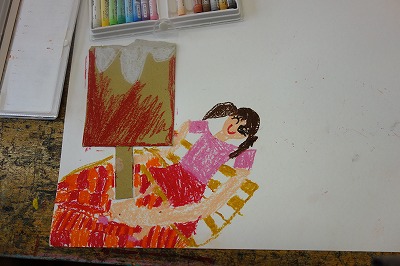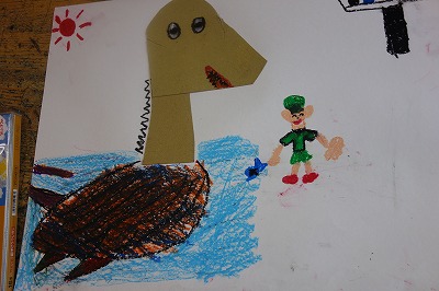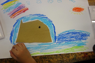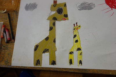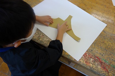 思いついた何かの形に近づくように、紙を組み合わせていくのではなく、たまたま手に取った黄ボール紙の形をよく見て、何かに「見立て」ます。何かに見立てられたら、画用紙に貼り、周りの様子も想像しながら絵に表していく題材です。