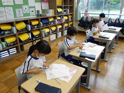 1学期末に、あさがおの色水遊びで染めた和紙を切り取って作りました。