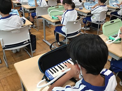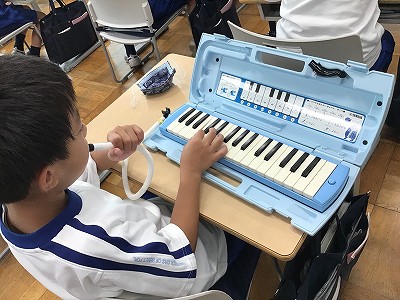 教室に戻り、鍵盤ハーモニカの時間です。まず、鍵ハモの向かっ左側が“低い音”、そして右側が高い音、の学習をしました。