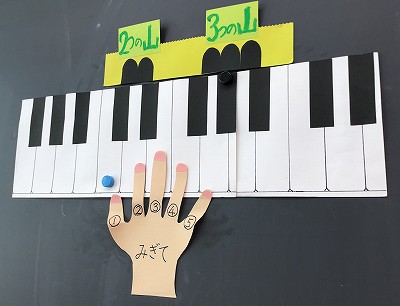 次の時間につなぐため、“みぎて”“親指の1”で“ド”の音を奏でてほしいな、とお話しました。