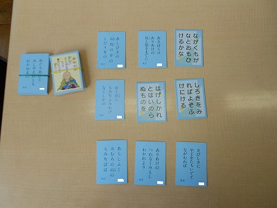 青色かるたの取り札1番~10番までを使って、ビンゴゲームをしました。