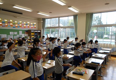「英語ビート」を元気いっぱいに踊り、英語の学習がスタートしました。