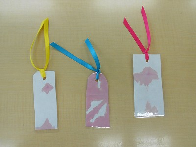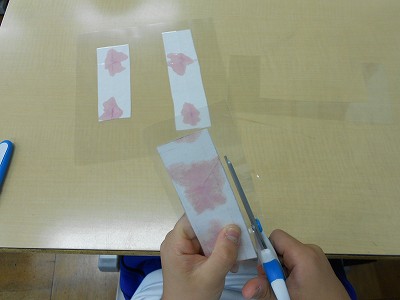 アサガオの色水で染めた和紙を使って、しおりを作っています。