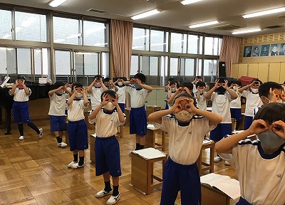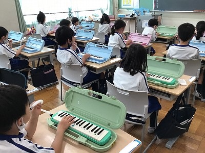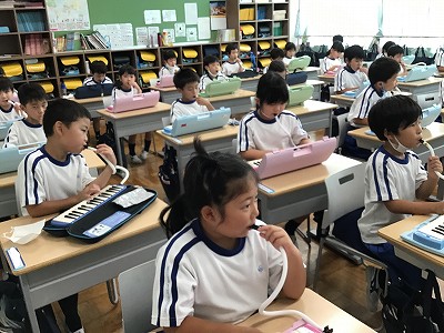 教室では、「まねっこけんハモ」からスタートです。「♪どこどこど」で使ったリズムでもOK、自分オリジナルのリズムでもOK、“一人とみんな”のまねっこ演奏の時間です。「聞き取ること」は、「感じ取ること」。お友達→自分の感覚を身につけて、「きく」「吹く」を学びます。
