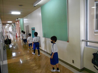 基本の行いの1つである「無言右側歩行」を意識して、5人ずつ保健室へ向かいます。