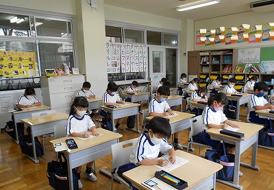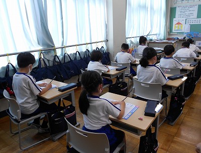 今日の1校時は、書写の時間です。「うつしまる」というドリルを使って、原稿用紙の使い方を学習しました。