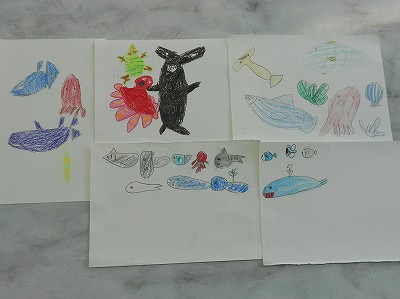 イベント係さん5人が「魚つりゲーム」を作っています。みんなが楽しく遊べるようにゲームのアイディアを出し合って、絵を描いていました。