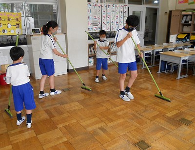 1学期は、すべて6年生がほうきをしてくれていましたが、今は1年生もお兄さん・お姉さんの動きを見ながらがんばっています。