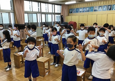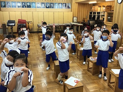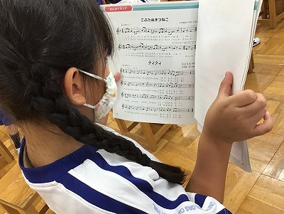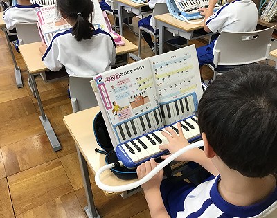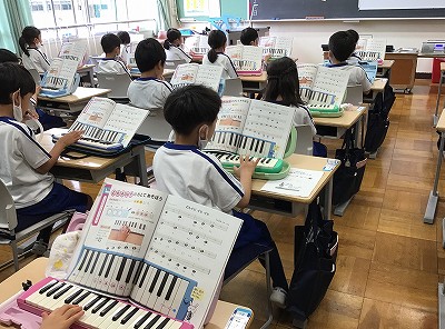教室では、鍵盤ハーモニカで“ドレミファソ”の指使いを学習しました。