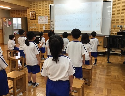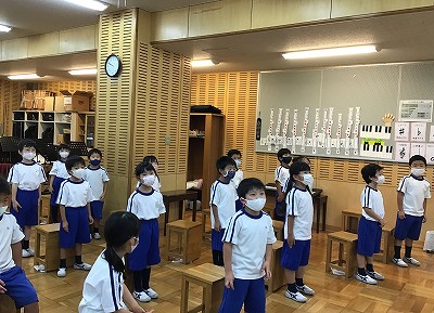 チームや列のグループで集まって…と進めたいところですが、座席の前での活動です。最後を担当するお友達だけを決めて、一発勝負の「ドレミのリレー!」にチャレンジしました。