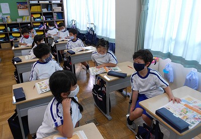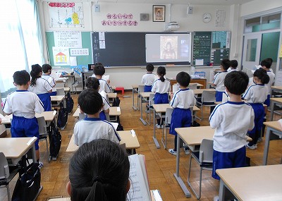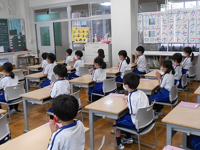 ブランコの取り合いしていた1年生に、6年生のお兄さんが“After you.(お先にどうぞ)”をやさしく教えてくれたお話を読みました。その後、このお話から「文教小学校のすてきなところ」をみんなで出し合いました。今日は、席に座ったままで、ペアで話し合いました。