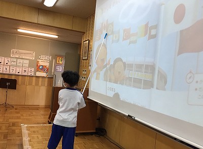 1年キッズに、さし絵の国旗とその国の名前を発表してもらいました。