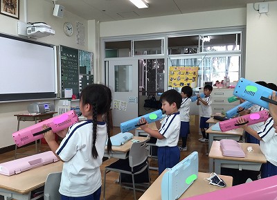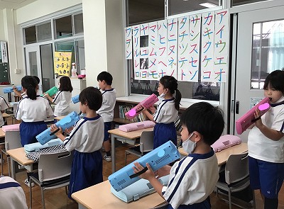教室では、“立奏用パイプ”をセットして、これまで学習している曲を演奏することにチャレンジしました。