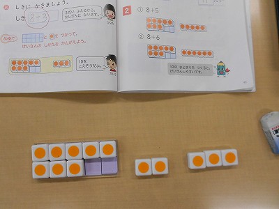 今日から「繰り上がりのあるたし算」の学習に入りました。今日は教科書の問題を見ながら、ブロックを操作し、10のまとまりを作って計算することを学習しました。